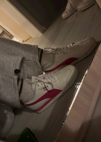 Pembe ve gri renklerde, lastik malzemeden yapılmış kadın spor ayakkabısı. Stiletto topuklu, desen içermeyen, günlük sokak modasına uygun şık tasarım. orjinal