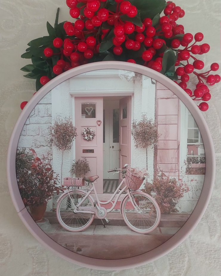 Nostaljik bisiklet ve ev temalı pembe pastel renkli teneke tepsi