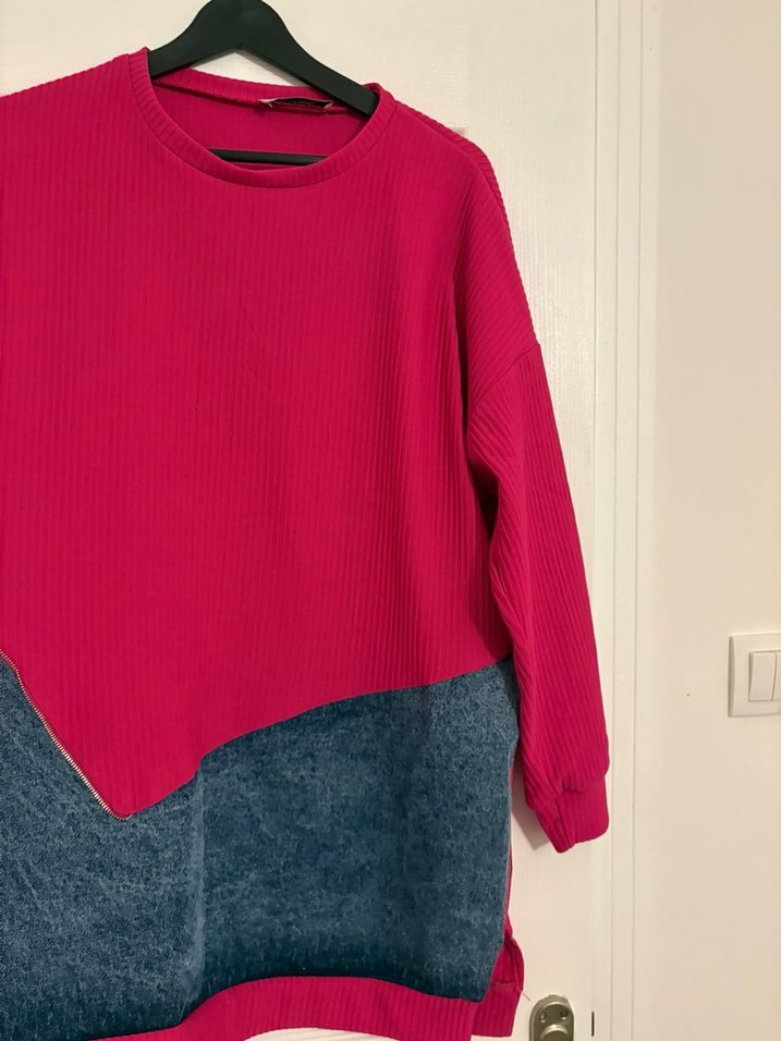 Pembe triko ve gri denim detaylı, uzun kollu, yuvarlak yakalı bol kesim. Hiçbir kusuru hasarı yok. İhtiyaç fazlasıdır. Hediyedir. Dar geldiği için satıyoruz. HİÇ GİYİLMEDİ. Beden L\ XL. Boyu : 78 cm iki kol arası: 57 cm.