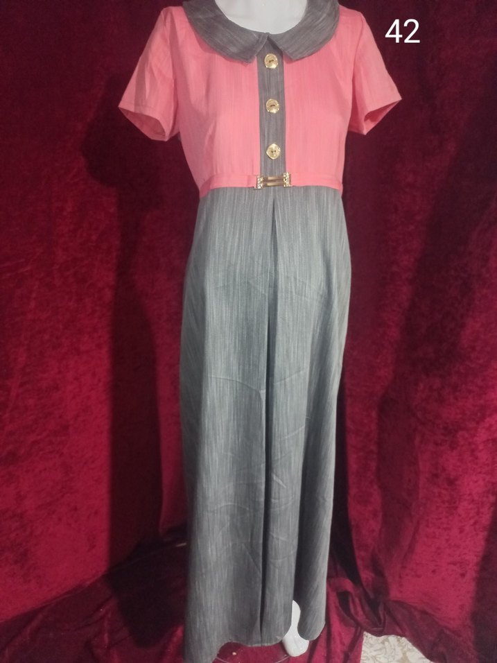 Pembe kısa kollu üst kısmı ve gri etek kısmı olan uzun hamilelik. Düğmeli ve kesik yaka detayı bulunur, Beden 42.