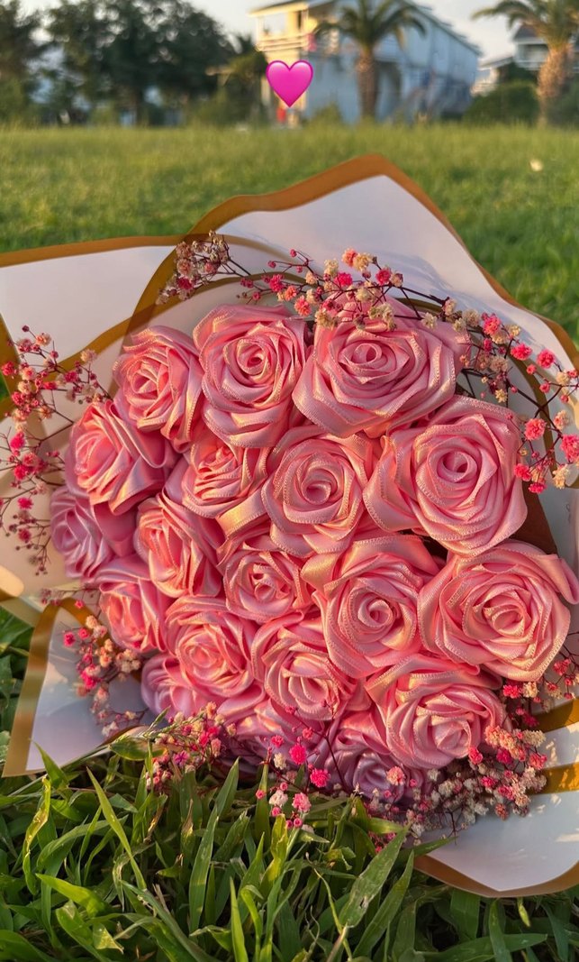 Altın kenarlı kağıda sarılı, pastel pembe güller ve küçük tamamlayıcı çiçeklerden oluşan buket. İstenilen model ve renk yapılır