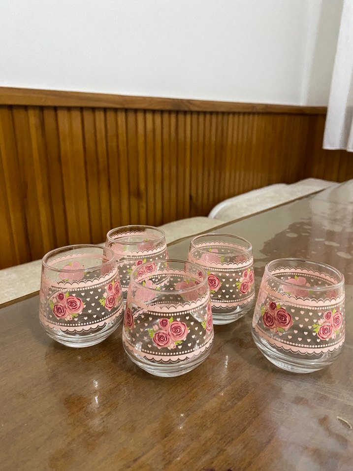 Beşli cam bardak seti, üzeri açık pembe gül ve kalp desenleriyle süslenmiştir.