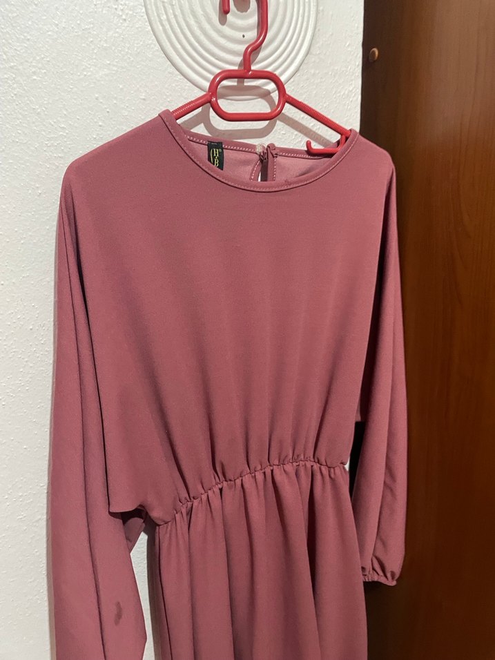 Pembe uzun kollu elbise, yuvarlak yaka ve salaş, drapeli kesime sahiptir. Yumuşak sentetik kumaştan yapılmış, minimalist tarzda günlük kullanıma uygundur.