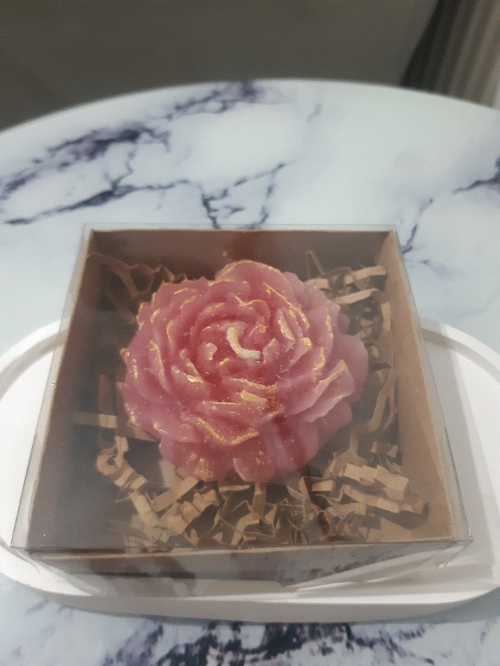Pastel pembe renkte, altın detaylı gül şeklinde mum. Şeffaf kutuda, kahverengi dekoratif kağıt dolgulu. doğum günü nişan söz düğün hediyelikleri isme özel hazırlanır