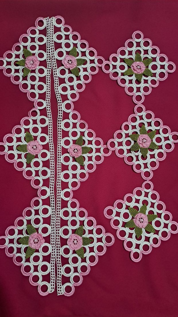 Beyaz yuvarlak desenler üzerinde pembe güller ve yeşil yapraklarla el işi yapılmış dantel havlu kenarı seti