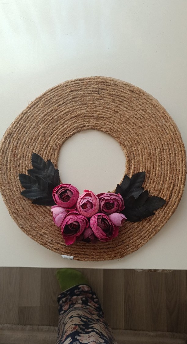 Doğal ipten örülmüş yuvarlak kapı süsü, koyu pembe yapay güller ve siyah yapraklarla süslenmiştir.