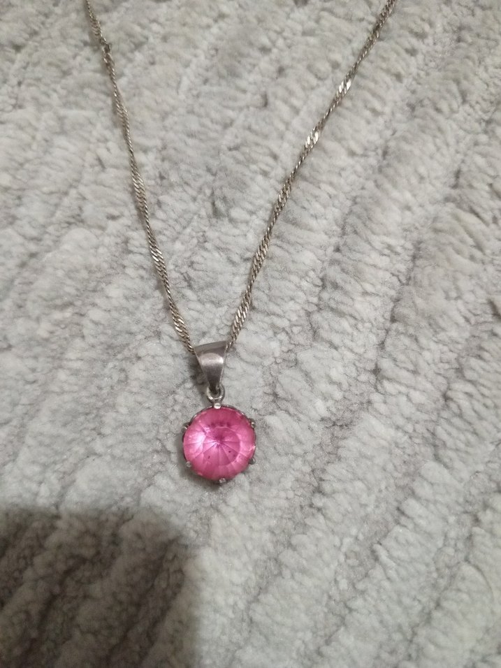 Pembe parlak taşlı, normal uzunlukta kadın kolye. Bohem ve rock punk tarzına uygun, günlük kullanıma ideal.