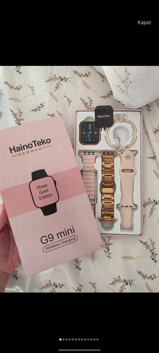 Pembe HainoTeko akıllı saat seti, yumuşak silikon ve metal kayış ile birlikte şarj kablosu içerir. HainoTeko G9 Mini Rose Gold Edition akıllı saat, kablosuz şarj özelliği ve değiştirilebilir kayışlarla birlikte gelir. Yaklaşık 1 senedir kullanıyorum çok güzel saat şarjı 3 gün gidiyor tansiyon oksijen ölçümü kalo atımı vs yapıyor yaklaşık olarak doğru veriler. Çok memnunum saatten başka saat aldığım için ihtiyacım kalmadı Sadece resimde görünen ufak çiziği var başka hiç bir sorunu yok Uyku takibi yapsın spor egzersiz yaparken verilerimi kaydetsin arada da gelen mesajları aramaları göreyim derseniz bu saat Harika işiize yarar. Sadece SMS wp mesajları cevaplsnamıyor