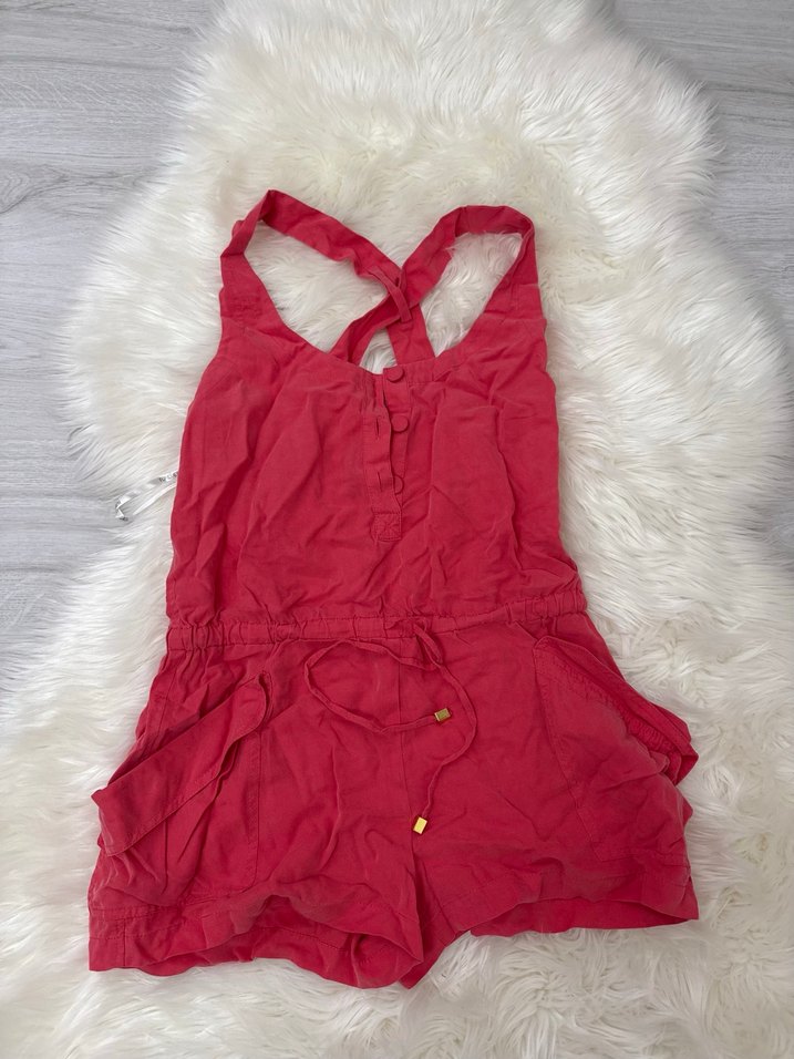 Pembe renkte, kolsuz ve halter yakalı tulum, düğmeli detaylara sahip. Yumuşak sentetik kumaştan, bohem tarzda rahat ve şık bir seçimdir.