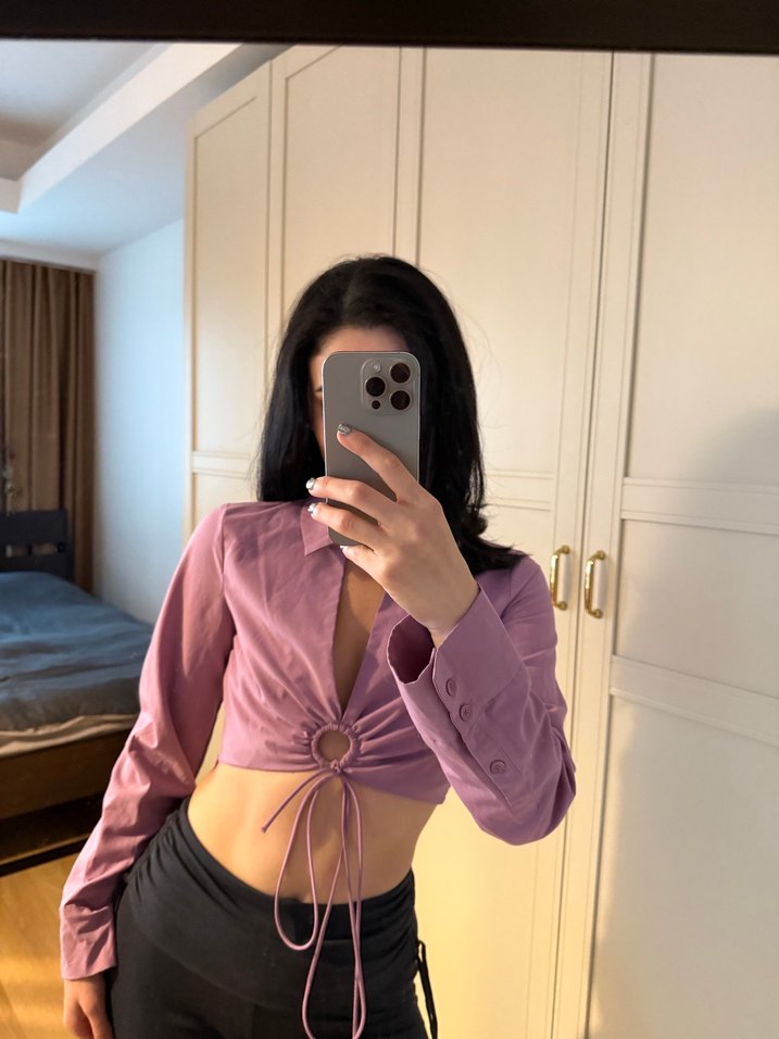 Pembe pastel renkte, satenimsi kumaştan yapılmış, halter yakalı ve uzun kollu, vücuda oturan midi boy kadın bluz. Günlük kullanım için rahat ve şık.