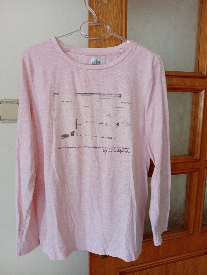 Pembe renkli, uzun kollu ve yuvarlak yakalı hamile tişörtü. Pamuklu kumaştan üretilmiş, baskılı ve rahat kesimli gündelik kullanıma uygun. Öndeki yazıları solmuştur ama söküğü yoktur.