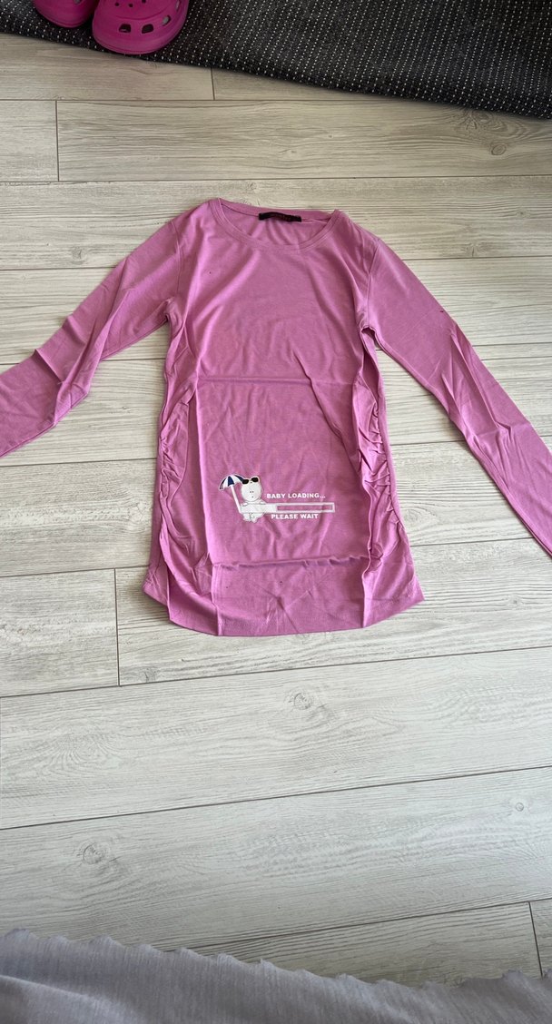 Pembe pastel renkte, yuvarlak yakalı, uzun kollu, bol kesim hamile tişörtü. Yumuşak likralı kumaştan, yanlarda büzgü detaylı, rahat ve şık. Sıfır ürün