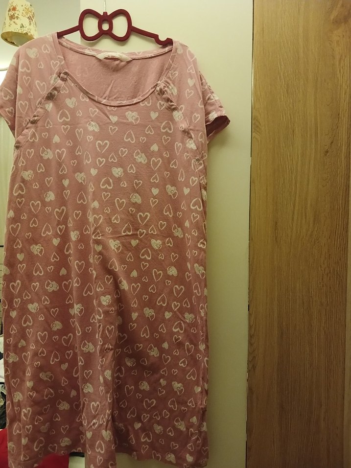 Pembe pastel renkte, kısa kollu, yuvarlak yakalı, midi boy ve bol kesim hamile ve emzirme geceliği. Rahat ve yumuşak kumaşlıdır.