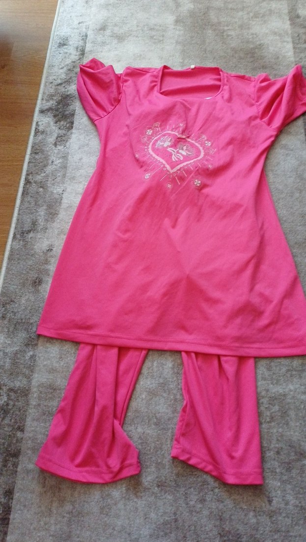 Parlak pembe renkte, kısa kollu, straplez yaka ve bol kesim hamile ve emzirme pijama takımı. Midi uzunlukta üst ve nakış detaylı pantolon içerir.