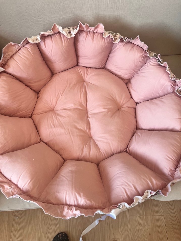 Pastel pembe renkte, yuvarlak ve yastıklı yapıya sahip, narin fırfırlı kenarları olan hamile ve emzirme yastığı.