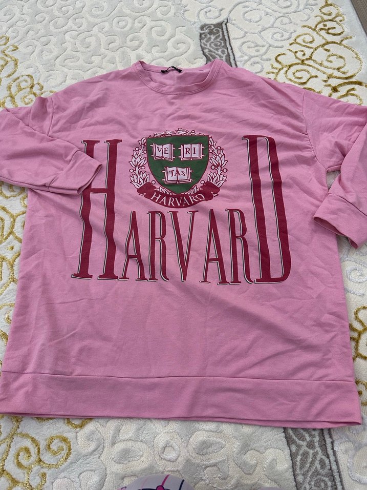 Pembe renkli, uzun kollu ve bisiklet yaka, bol kesim kadın sweatshirt. Harvard baskılı, örme dokulu ve günlük kullanıma uygun. XL yazıyor ama 2xl a bile rahat okur baya oversize. Tunik şeklinde kullanıma uygun