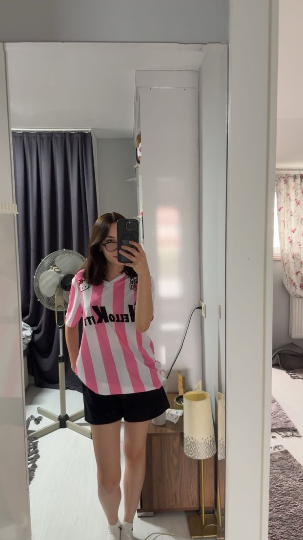 kısa kollu kadın; pembe beyaz çizgili ve Hello Kitty baskılıdır. arkasında 00 numara yazmaktadır günlük ve sokak stiline uygundur forma veya tişört olarak kullanıma uygundur sadece 1 kere giydim lekesiz hatasiz