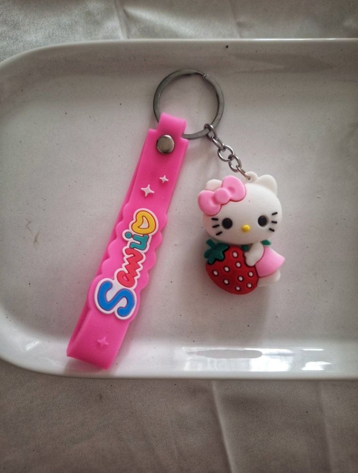 Renkli pembe anahtarlık, Hello Kitty figürü ve çilek detaylı, 'Sanrio' yazılı püsküllü askısı ile sokak modası ve eğlenceli tarzı bir araya getirir.