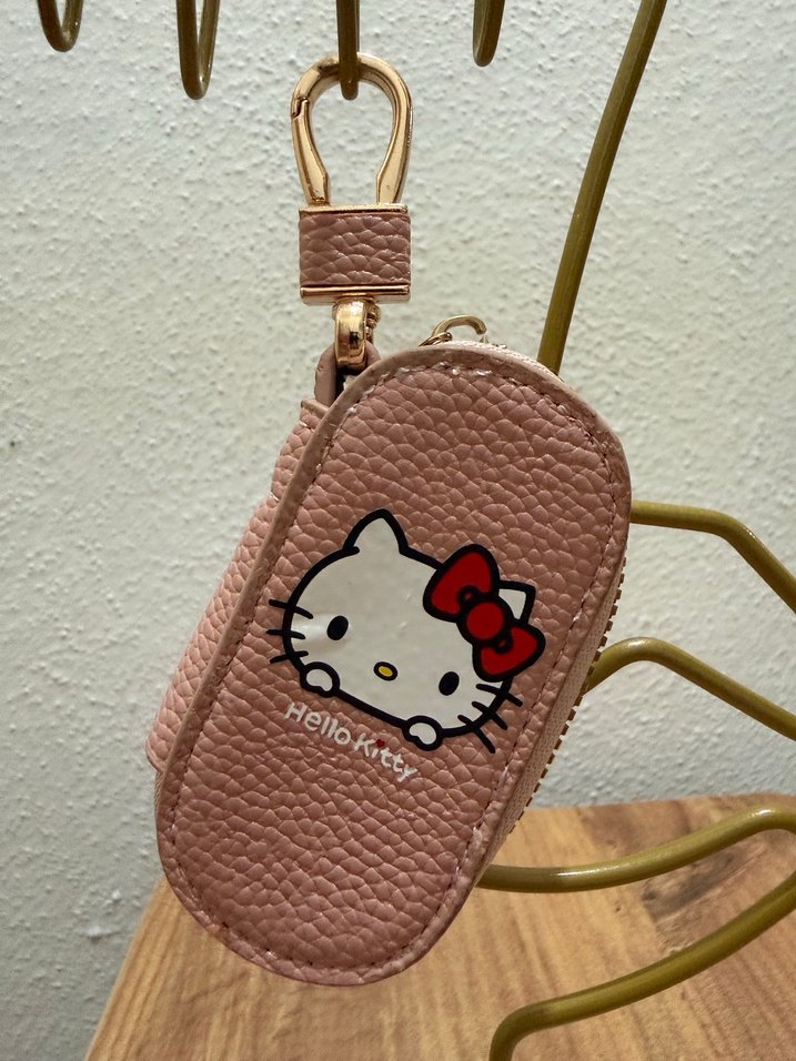 Pembe pastel renkte, fermuarlı Hello Kitty desenli anahtarlık, rahat ve şık sokak stili için uygun.