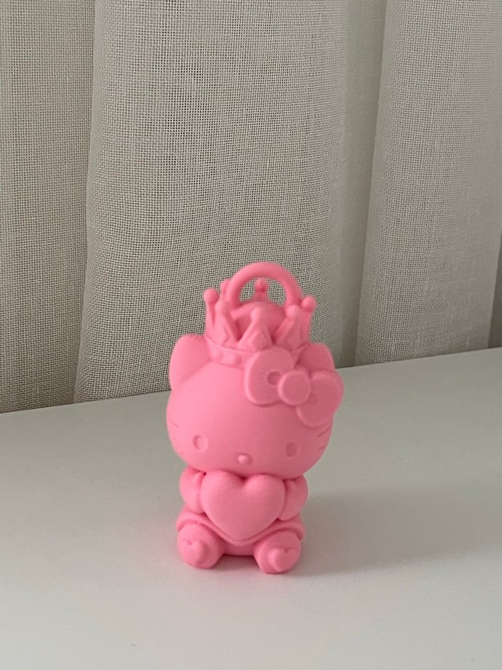 Pembe renkli Hello Kitty figürü, kalp tutuyor ve taç takıyor. Küçük ve detayları yumuşak tasarlanmış.