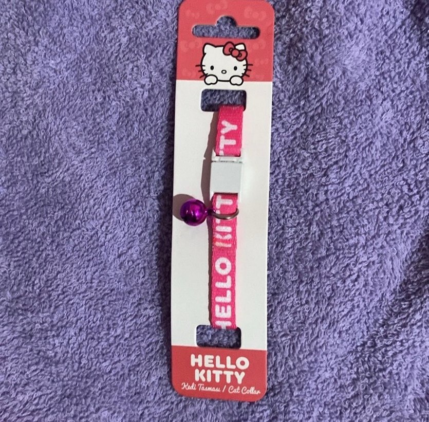 Pembe Hello Kitty kedi tasması, küçük zil ve ayarlanabilir kayış üzerinde "HELLO KITTY" yazısı ile renkli bir dokunuş sağlar.