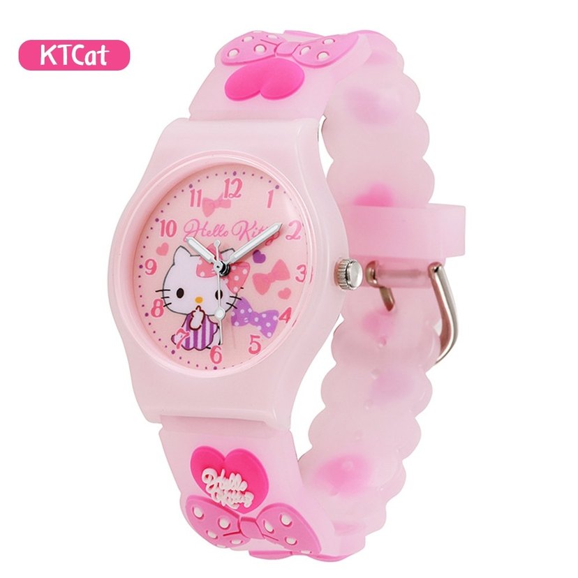 Pembe Hello Kitty baskılı kayışta tokalı, renkli ve rock punk tarzında kız çocuk saati. Kayışta kabartma fiyonk ve kalpler bulunur.