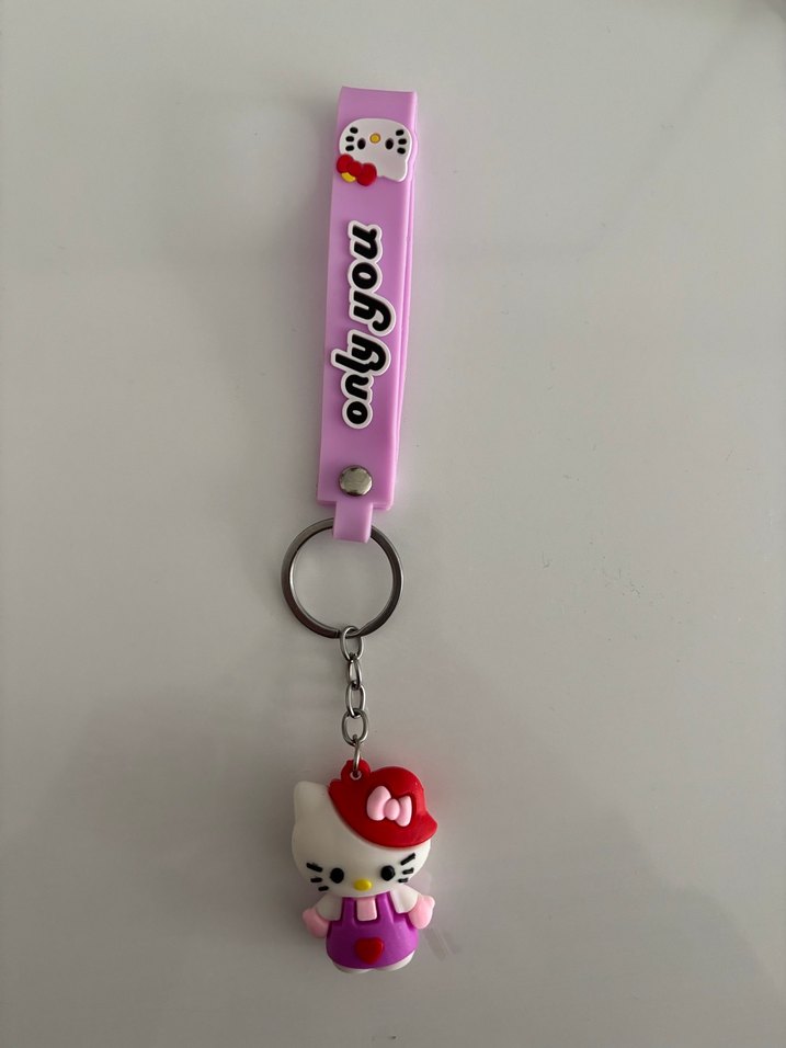 Pembe kurdele üzerinde 'only you' yazısı ve kırmızı şapkalı Hello Kitty figürü bulunan renkli anahtarlık. Sokak modasına uygun minimal tasarım. ️