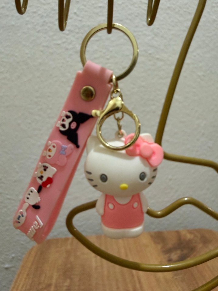 Pembe renkli, Hello Kitty figürlü ve renkli püsküllü, rock punk tarzı kadın anahtarlığı.