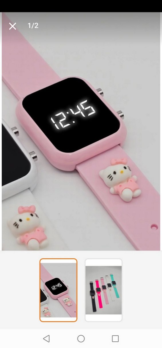 Pembe renkte, Hello Kitty figürlü kordonlu, dijital saat ekranında 12:45 gösteren renkli akıllı saat. Yumuşak ve rahat kayışa sahiptir. ⌚