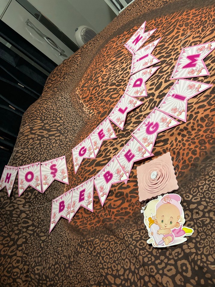 Pastel pembe renkte 'Hoş Geldin Bebeğim' yazılı parti süsü. Tatlı bebek figürü ve çiçek detayı içerir.