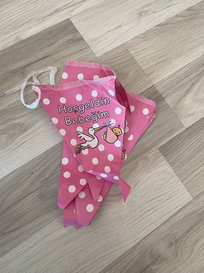 Beyaz puantiyeli pastel pembe parti afişi, "Hoşgeldin Bebeğim" yazısı ve leylek figürüyle yeni doğanı karşılamaya hazır. Görselde görüldüğü gibi kırışık