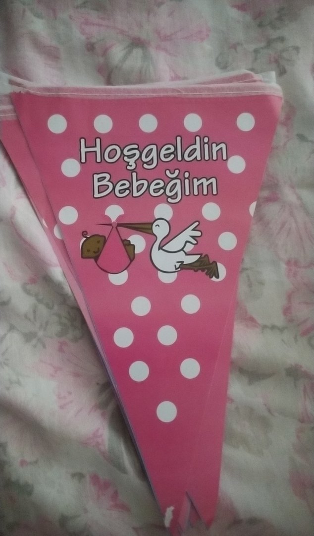 Pastel pembe ve beyaz puantiyeli, üzerinde 'Hoşgeldin Bebeğim' yazılı ve leylek figürlü parti bayrağıdır.