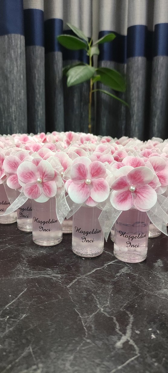 Üzerinde "Hoşgeldin İnci" yazan, pastel renkli çiçek ve kurdele süslemeli küçük pembe hediyelik şişeler.