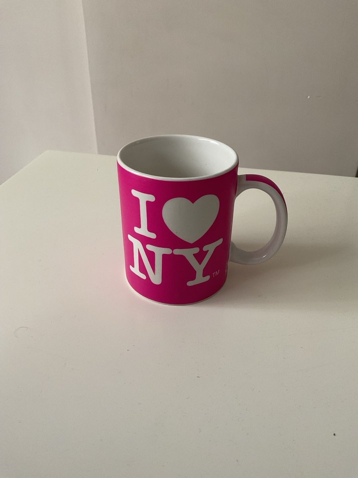Pembe seramikten yapılmış, üzerinde renkli "I ♥ NY" baskısı bulunan bir kupa. ☕