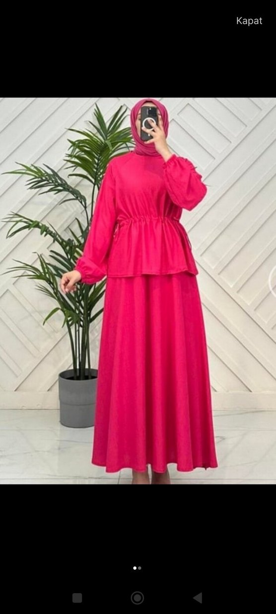 Pembe renkte, uzun ve bol kesimli, yüksek yakalı, uzun kollu, drapeli tasarıma sahip kadın ikili esnek kumaştan, günlük kullanıma uygun modern ve sade stil sunar.
