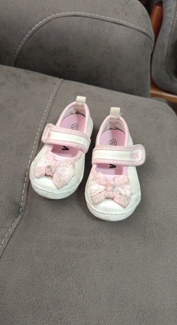 Pastel pembe renkli, lastik tabanlı kız çocuk ilk adım ayakkabısı, fiyonk detaylı ve tie-dye desenli sokak stiliyle. orjinal vicco kız çocuk ayakkabısı beyaz olduğu için kirlenmiş. 2-3 defa giydi