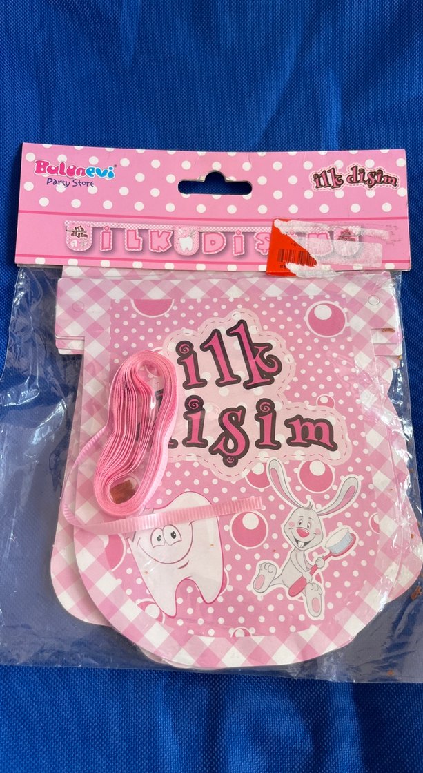 Pembe ve renkli, "11k Dişim" yazılı diş temalı parti süsleri seti. Askı için pembe kurdele içerir.