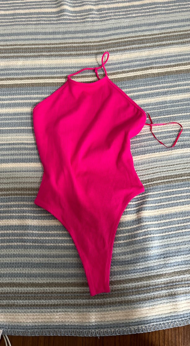 İnce askılı, vücuda oturan pembe kadın mayo, rahat ve şık bir plaj görünümü sunar. Normal boyda ve desensizdir.