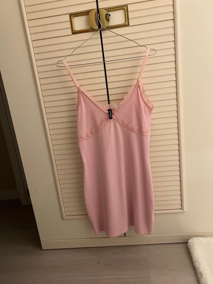 İnce askılı, pembe pastel renkte, sade ve desen içermeyen, vücuda oturan midi gece elbisesi.