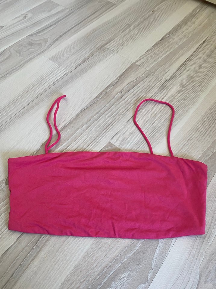 Pembe, ince askılı ve midi boyda, renkli athleisure tarzında sade ve desensiz bir sporcu sütyeni.