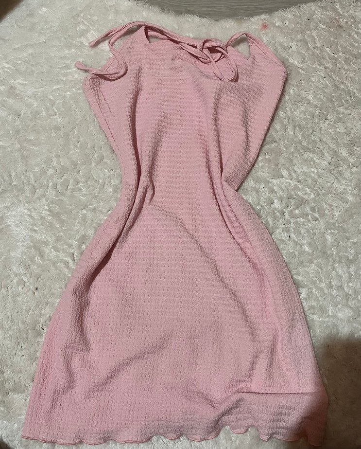 Pembe pastel renkte, ince askılı ve vücuda oturan midi uzunlukta rahat bir kadın elbisesi. Sadece bir kez giydim xs s beden giyenlere uyar