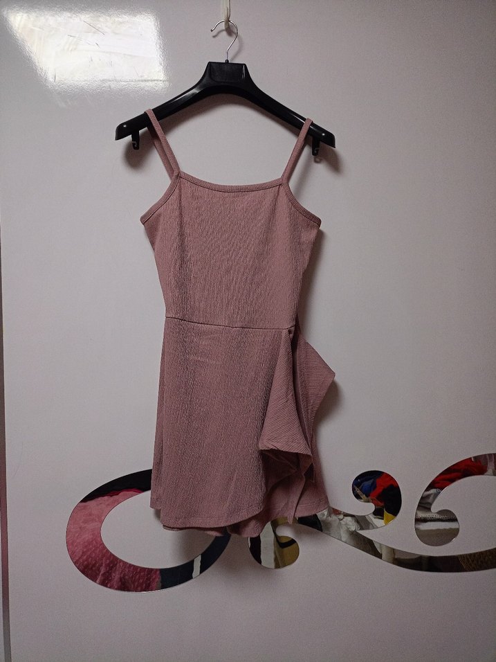 Pembe, ince askılı ve pile detaylı, yumuşak sentetik kumaştan yapılmış, dar kesim kız elbisesi.