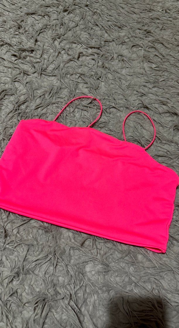 Pembe renkli, ince askılı ve desensiz spor tarzı büstiyer. Normal, midi boyda, athleisure ve streetwear için uygundur. Hiç giyilmedi