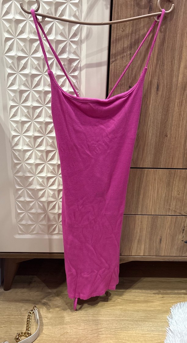 Pembe, ince askılı, straplez yakalı ve drapeli detaylı, vücuda oturan uzun elbisedir. Parlak sentetik kumaştan, minimalist ve çağdaş tarzda.