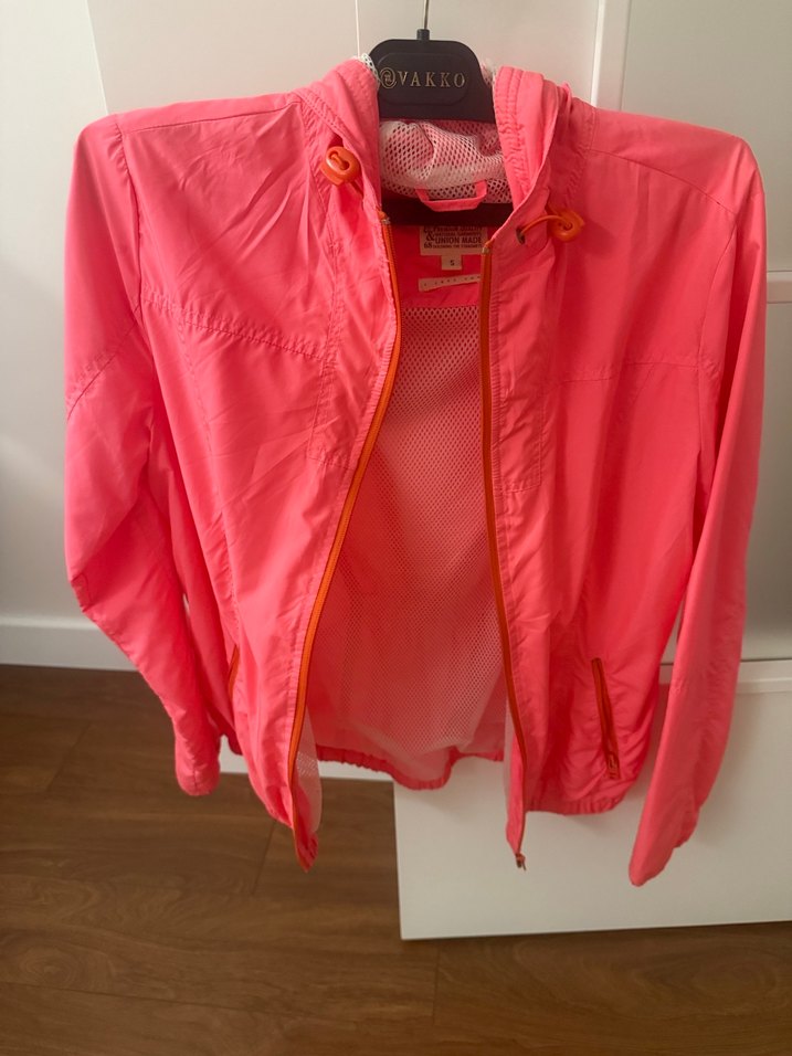 Dolgulu, pembe kadın ceket; yüksek yakalı, uzun kollu ve fermuarlıdır. Parlak sentetik kumaştan yapılmış, dış mekan kullanımı için uygundur.