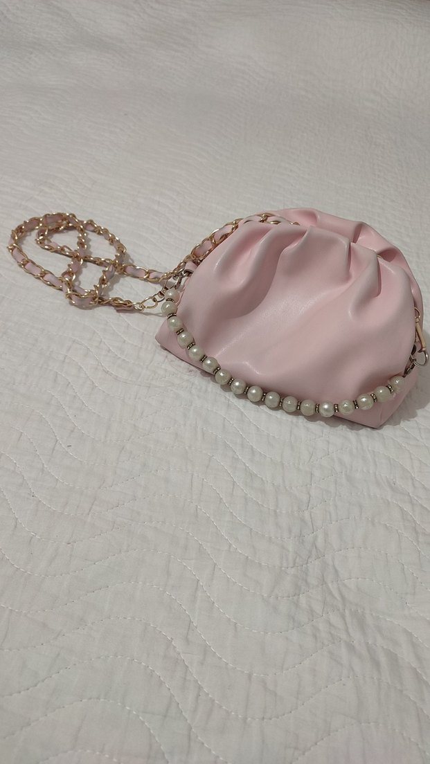 Yumuşak pembe pastel renkte, zincir ve inci detaylı kadın çantası.