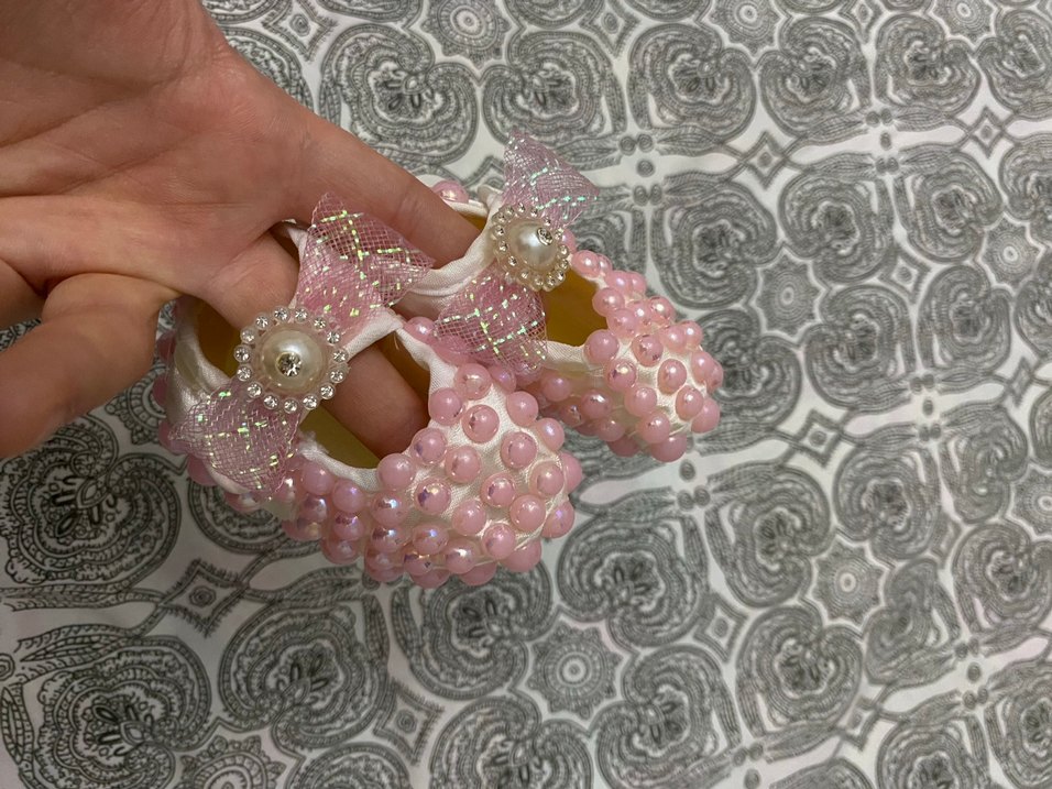 Pembe renkli, örme kumaştan yapılmış, payet ve işlemeli inci detaylı, bohem tarzda fiyonk süslemeli kız çocuk özel ayakkabısı.