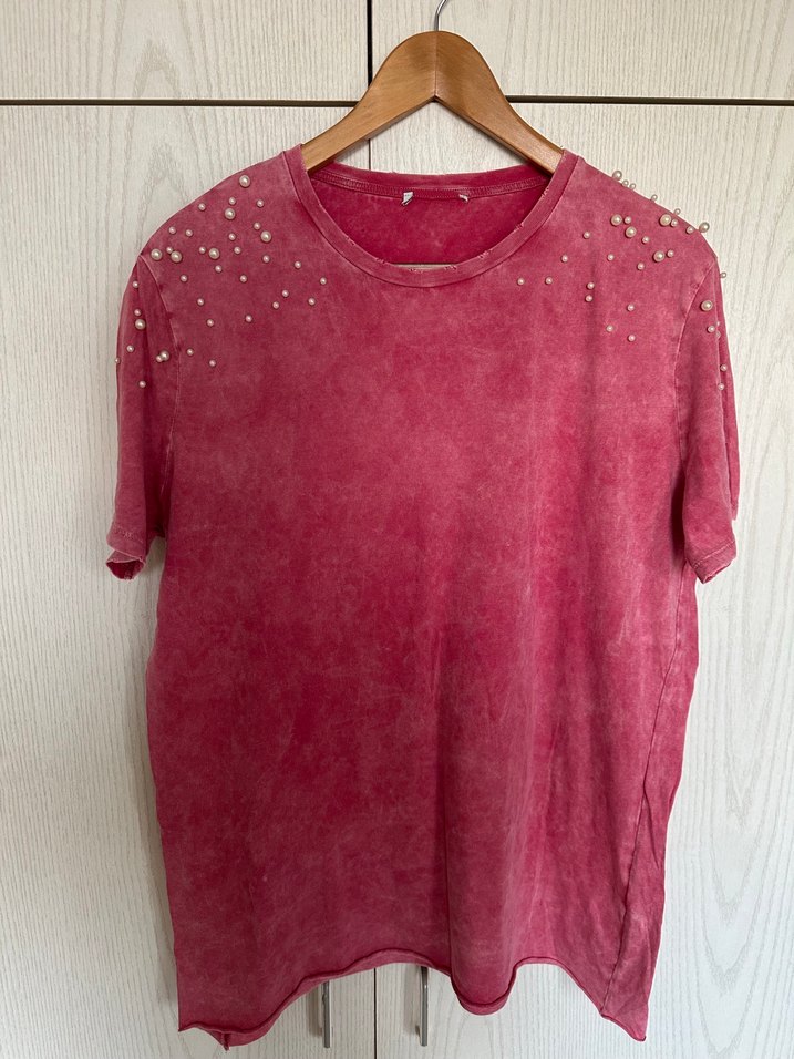 Pembe, incili kısa kollu, bol kesim pamuk tişört. Etiketi kesik. Hiç kullanmadım. İncilerinde herhangi bir sorun yok. Eskitme tarzda. Alan kişiye şans getirsin ✨