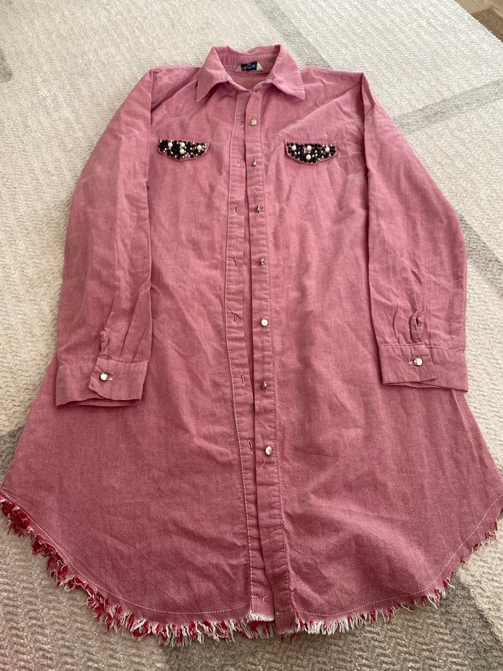 Pembe renkli, düğmeli cepleri olan uzun kollu kadın gömleği. Geniş kesimli, uzun boylu ve çentikli yaka detaylıdır. Salaş ve günlük sokak stiline uygundur. etek ucu püsküllüdür.