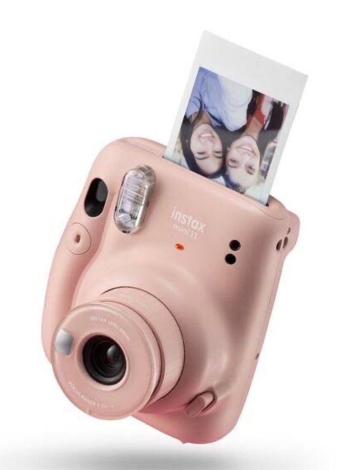 Pastel pembe renkli Instax Mini film kamera, kompakt tasarım ve dahili flaş ile anında fotoğraf baskısı sağlar.